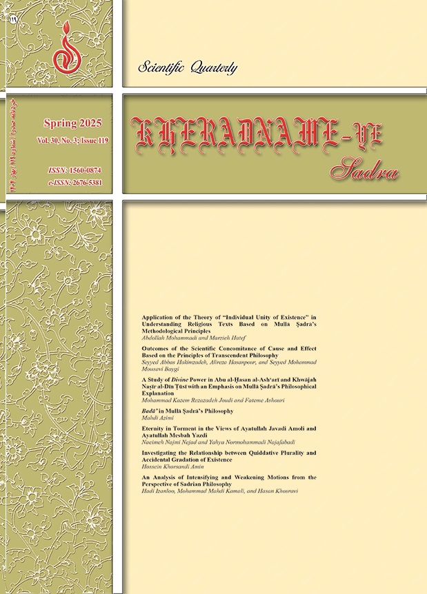 List of Articles Open Access Article Abstract Page Full-Text 1 - سرمقاله S. Mohammad Khamenei 20.1001.1.15600874.1404.30.3.8.3 Open Access Article Abstract Page Full-Text 2 - Application of the Theory of “Personal Unity of Existence” in Understanding Religious Texts Based on Mullā Ṣadrā’s Methodological Principles Abdullah Mohammadi Marzieh Hatef 20.1001.1.15600874.1404.30.3.7.2 Open Access Article Abstract Page Full-Text 3 - Outcomes of the Scientific Concomitance of Cause and Effect Based on the Principles of Transcendent Philosophy Seyyed Abbas Hakimzadeh Kherad Alireza Hassanpour Seyyed Mohammad Mousavi Baygi 20.1001.1.15600874.1404.30.3.6.1 Open Access Article Abstract Page Full-Text 4 - A Study of Divine Power in Abu al-Ḥasan al-Ashʻarī and Khwājah Naṣīr al-Dīn Ṭūsī with an Emphasis on Mullā Ṣadrā’s Philosophical Explanation Mohammad Kazem Rezazadeh Joudi Fatemeh Ashouri 20.1001.1.15600874.1404.30.3.5.0 Open Access Article Abstract Page Full-Text 5 - Badā’ in Mullā Ṣadrā’s Philosophy Mahdi Azimi 20.1001.1.15600874.1404.30.3.2.7 Open Access Article Abstract Page Full-Text 6 - Eternity in Torment in the Views of Ayatullah Javadi Amoli and Ayatullah Mesbah Yazdi Naeimeh Najmi Nejad Yahya Noormohammadi Najaf Abadi 20.1001.1.15600874.1404.30.3.4.9 Open Access Article Abstract Page Full-Text 7 - Investigating the Relationship between Quiddative Plurality and Accidental Gradation of Existence Hossein Khorsandi Amin 20.1001.1.15600874.1404.30.3.3.8 Open Access Article Abstract Page Full-Text 8 - An Analysis of Intensification and Weakening in Motion from the Perspective of Sadrian Philosophy Hadi Izanloo Mohammad Mahdi Kamali Hasan Khosravi 20.1001.1.15600874.1404.30.3.1.6